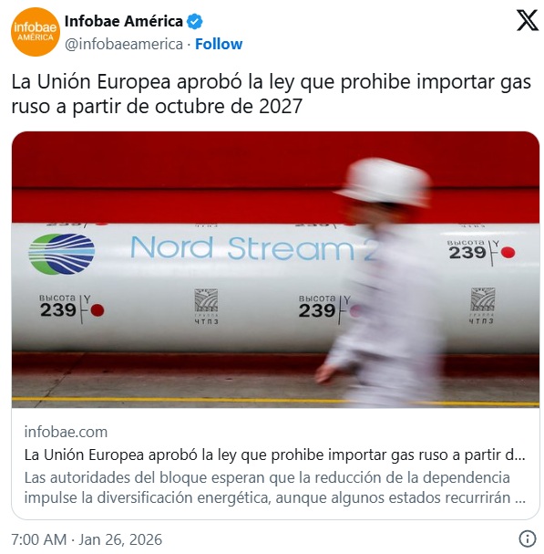 La Unión Europea aprobó este lunes su plan definitivo para prohibir las importaciones de gas ruso antes de que finalice 2027, en un paso que convierte en ley el compromiso del bloque de romper la relación energética con su antiguo principal proveedor tras la invasión rusa de Ucrania en 2022.