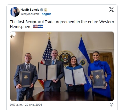 El Salvador y Estados Unidos firmaron un acuerdo comercial recíproco, el primero de este tipo en el hemisferio occidental, según anunció el presidente salvadoreño Nayib Bukele. El pacto elimina el arancel del 10 % a las exportaciones salvadoreñas hacia EE. UU., fortaleciendo la relación bilateral, de acuerdo con la ministra de Economía, María Luisa Hayem.