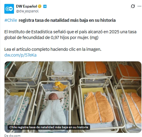Chile alcanzó en 2025 la tasa de natalidad más baja de su historia, con 0,97 hijos por mujer, según el INE. La caída comenzó en 2010, debido a la reducción de embarazos adolescentes y a la postergación de la maternidad.