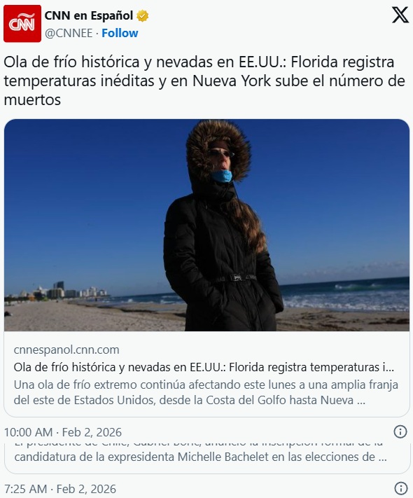 Una ola de frío extremo continúa afectando este lunes a una amplia franja del este de Estados Unidos, desde la Costa del Golfo hasta Nueva Inglaterra, tras el paso de una bomba ciclónica que dejó fuertes nevadas, vuelos cancelados y condiciones peligrosas en carreteras.