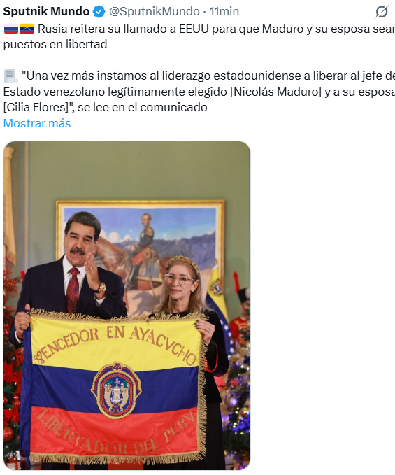 El llamado reafirma el respaldo de Moscú al mandatario y subraya que, a juicio de Rusia, ambos deben ser puestos en libertad por considerarse autoridades legítimas de un Estado soberano.