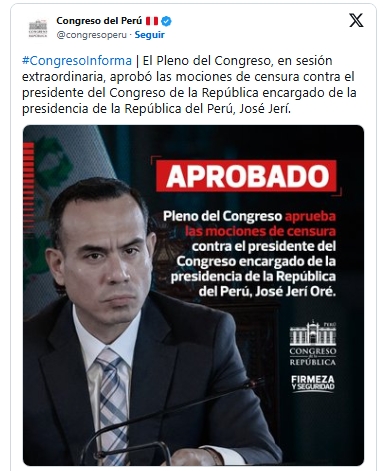 Con esta votación, el Legislativo peruano abre un nuevo capítulo de incertidumbre política, mientras se define el mecanismo constitucional para la sucesión en el Ejecutivo.