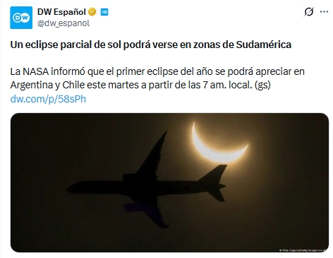 Un eclipse parcial de sol se podrá ver este martes en zonas de Sudamérica, África, la Antártida y los océanos Pacífico, Atlántico e Índico, según divulgó la NASA en su página web, marcando el primero de estos acontecimientos en el año 2026.