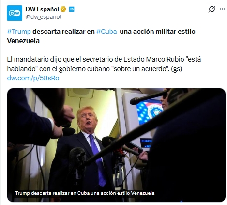 El presidente estadounidense, Donald Trump, dijoque su secretario de Estado, Marco Rubio, está "hablando con Cuba ahora mismo" sobre un "acuerdo", pero consideró "no necesaria" una operación militar en el país similar a la de Venezuela.