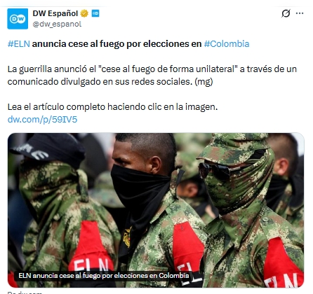 El ELN anunció un cese al fuego unilateral de cara a las próximas elecciones legislativas y presidenciales en Colombia, en medio de un aumento de la violencia política con atentados, secuestros y amenazas contra candidatos. El país elegirá nuevos congresistas el 8 de marzo y al sucesor del presidente Gustavo Petro el 31 de mayo.