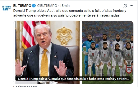El presidente de Estados Unidos, Donald Trump, solicitó públicamente al gobierno de Australia que conceda asilo político a las integrantes de la selección femenina de fútbol de Irán, tras su participación en la Copa Asiática Femenina de la AFC. A través de la red social Truth Social, Trump advirtió que si Australia no les brinda protección, Estados Unidos estaría dispuesto a recibir a las jugadoras.