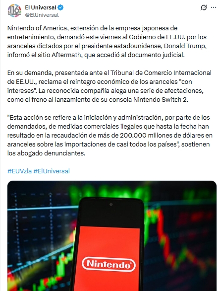 La empresa Nintendo of America presentó una demanda contra el Gobierno de Estados Unidos ante el Tribunal de Comercio Internacional de Estados Unidos para reclamar el reembolso de aranceles pagados, junto con intereses. La compañía sostiene que las medidas comerciales impulsadas por el presidente Donald Trump afectaron sus operaciones, incluido el lanzamiento de la consola Nintendo Switch 2.