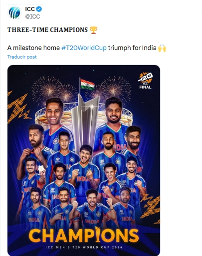 La Selección de cricket de India conquistó el título de la Copa Mundial T20 de Críquet tras vencer a Selección de cricket de Nueva Zelanda en la final disputada en el Estadio Narendra Modi de Ahmedabad, en el estado de Gujarat.