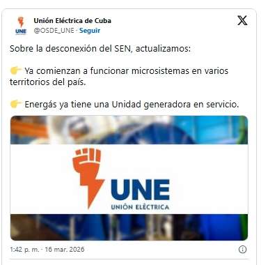 A través de mensajes publicados en la red social X, la empresa y el Ministerio de Energía y Minas de Cuba señalaron que ya funcionan microsistemas eléctricos en varios territorios del país, como parte de las acciones para normalizar el servicio en todo el territorio nacional.