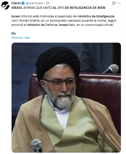 El ministro de Defensa de Israel, Israel Katz, afirmó que el ministro de Inteligencia de Irán, Ismail Jatib, murió en un bombardeo ocurrido la noche anterior. Según el comunicado, Jatib era responsable del sistema interno de represión del régimen iraní.
