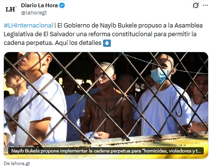 El presidente de El Salvador, Nayib Bukele, promovió una reforma constitucional que establece la prisión perpetua para delitos graves como homicidio, violación y terrorismo. La iniciativa fue aprobada de forma casi unánime por el Congreso y elimina la prohibición previa de este tipo de penas, que antes tenían un máximo de 60 años.