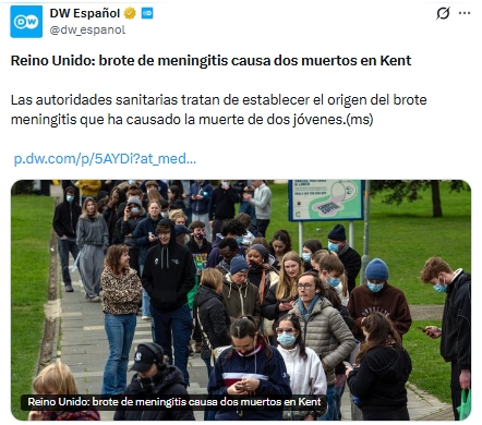 La Universidad de Kent, en Reino Unido, suspendió los exámenes presenciales tras un brote de meningitis que ha dejado dos fallecidos, entre ellos un estudiante universitario. Las autoridades confirmaron al menos 15 casos, en lo que ha sido calificado como una situación “sin precedentes” por el ministro de Salud, Wes Streeting.