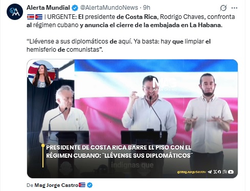 El presidente de Costa Rica, Rodrigo Chaves, informó que su país dejará de reconocer al actual Gobierno de Cuba como legítimo y, como parte de esa decisión, ordenó el cierre de la embajada costarricense en La Habana. La medida también contempla una reducción de la representación diplomática cubana en territorio costarricense, permitiendo únicamente la permanencia del personal consular. El mandatario justificó la postura señalando preocupaciones por la situación política y social en la isla, así como por las condiciones en que vive la población cubana.