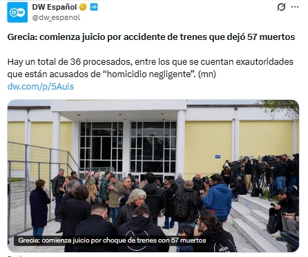 Un total de 36 acusados, incluidos altos funcionarios, un expresidente de la empresa estatal Ferrocarriles de Grecia (OSE), directivos de Hellenic Train y exautoridades del Ministerio de Transporte, enfrentan cargos por homicidio negligente y otros delitos que podrían derivar en cadena perpetua.