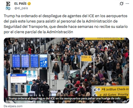 El encargado de política fronteriza de la Casa Blanca, Tom Homan, confirmó que Estados Unidos desplegará agentes del Servicio de Inmigración y Aduanas (ICE) en aeropuertos para apoyar a la Administración de Seguridad del Transporte (TSA), cuyos empleados no han recibido salario desde febrero.