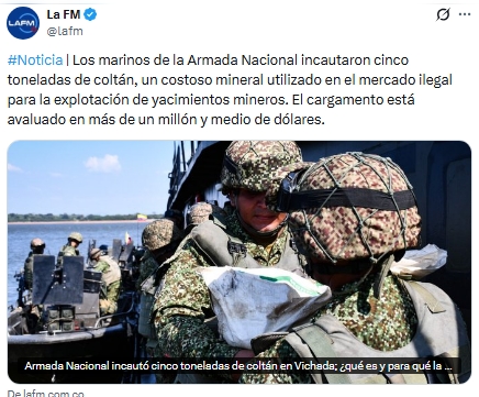 La fuerza pública de Colombia decomisó cinco toneladas de coltán, un mineral considerado “tierra rara”, durante una operación en la región del Orinoco, en el oriente del país.