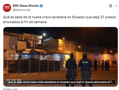 El Servicio Nacional de Atención Integral (Snai) confirmó que 27 reclusos murieron ahorcados la tarde del domingo en una prisión de Machala, provincia ecuatoriana de El Oro. Según el informe oficial, los internos se habrían asfixiado entre ellos, provocando la muerte inmediata por suspensión.