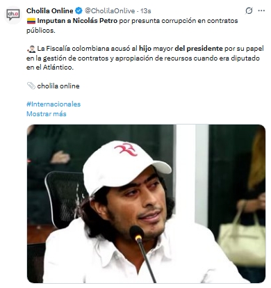 Imputan seis delitos a Nicolás Petro, hijo del presidente colombiano Gustavo Petro
