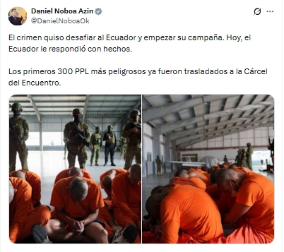 El presidente de Ecuador, Daniel Noboa, presentó este lunes a los primeros 300 presos considerados los más peligrosos del país que fueron trasladados a la nueva megacárcel de alta seguridad “Cárcel del Encuentro”, en respuesta a la reciente masacre carcelaria.