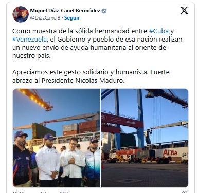 El presidente Miguel Díaz-Canel expresó su agradecimiento al Gobierno de Venezuela por el envío de más de 5.000 toneladas de ayuda humanitaria destinadas a las provincias orientales de Cuba, afectadas por el huracán Melissa.