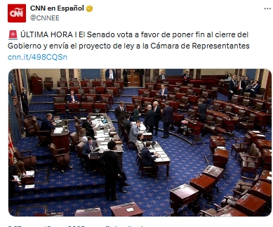 El Senado de Estados Unidos aprobó este lunes una medida de financiamiento destinada a reabrir el Gobierno federal, que permanecía cerrado en el período más largo de la historia del país. El proyecto ahora pasa a la Cámara de Representantes, donde los líderes republicanos confían en lograr su aprobación tan pronto como este miércoles.