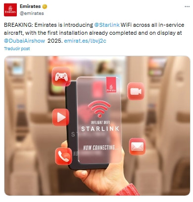 Emirates ofrecerá wifi gratuito y ultrarrápido con tecnología Starlink en sus vuelos