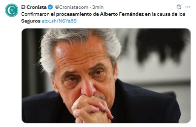 La Justicia argentina confirmó este martes el procesamiento del expresidente Alberto Fernández en la causa que investiga supuestas irregularidades en la contratación de seguros durante su gestión, informó Cadena 3. Con el fallo de la Cámara Federal de Comodoro Py, el exmandatario queda a un paso del juicio oral.