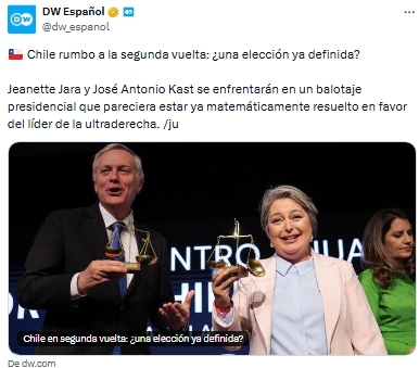 Jara obtuvo una victoria por 2,9 puntos porcentuales el domingo ante Kast, pero el bloque de derecha, que compitió con tres candidatos de diferentes fuerzas, logró más del 50% de los votos y los sondeos pronostican una victoria de Kast en el segundo turno.