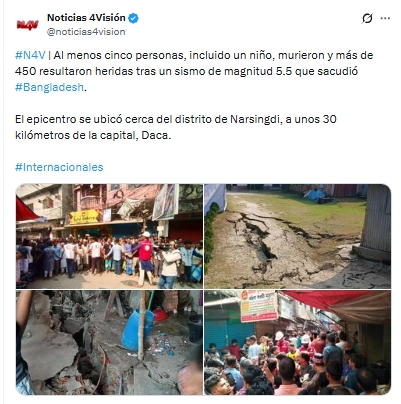 Un terremoto de magnitud 5,5 sacudió este viernes el centro de Bangladés, dejando al menos ocho personas fallecidas y más de cien heridas, según informaron fuentes oficiales. El sismo tuvo su epicentro cerca de la ciudad de Narsingdi.