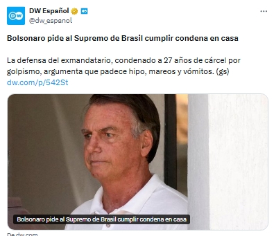 La defensa del expresidente brasileño Jair Bolsonaro solicitó este viernes a la Corte Suprema de Brasil que le permita cumplir bajo prisión domiciliaria la condena de 27 años de cárcel que le fue impuesta por su participación en una trama golpista.