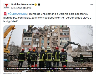 El presidente de Estados Unidos, Donald Trump, dio este viernes un ultimátum a su homólogo ucraniano, Volodímir Zelenski, para que acepte antes del próximo jueves 27 de noviembre, Día de Acción de Gracias, el plan de paz propuesto por la Casa Blanca para poner fin a la guerra en Ucrania.