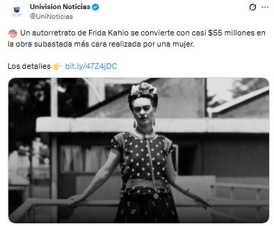 La obra, valorada entre 40 y 60 millones, había sido vendida previamente en 1980 por solo 51.000 dólares. Con esta cifra récord, Kahlo también mantiene el tercer puesto entre las obras más caras hechas por una mujer, con su cuadro “Diego y yo”, vendido en 2021 por 34,9 millones.