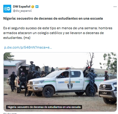 Un número aún no determinado de estudiantes fue secuestrado la madrugada de este viernes en un colegio católico en el estado de Níger, al oeste de Nigeria. El hecho ocurre apenas días después del rapto de 25 niñas en otra escuela y del ataque a una iglesia en la misma región.