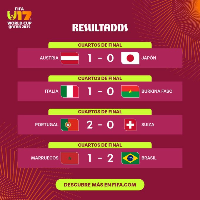 Las selecciones de Brasil, Portugal, Austria e Italia aseguraron este viernes su clasificación a las semifinales del Mundial Sub-17 en Qatar, donde disputarán el último paso hacia la gran final. Los cruces quedaron definidos de la siguiente manera: Brasil vs. Portugal y Austria vs. Italia.