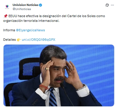 La decisión del Gobierno de Estados Unidos de designar al presunto Cártel de los Soles, vinculado a estructuras del chavismo, como organización terrorista extranjera (OTE) entra en vigor este lunes 24 de noviembre de 2025, abriendo la puerta a nuevas medidas de presión sobre el presidente venezolano Nicolás Maduro.