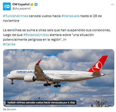 Turkish Airlines canceló sus vuelos previstos hacia Venezuela entre el 24 y el 28 de noviembre, con lo que se suma a otras seis aerolíneas que han adoptado esta medida.