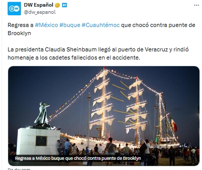 El buque escuela mexicano que chocó en mayo pasado contra el puente de Brooklyn, en Nueva York, regresó a México para un evento oficial en el puerto de Veracruz, en el que la presidenta Claudia Sheinbaum rindió homenaje a los cadetes fallecidos en el accidente.