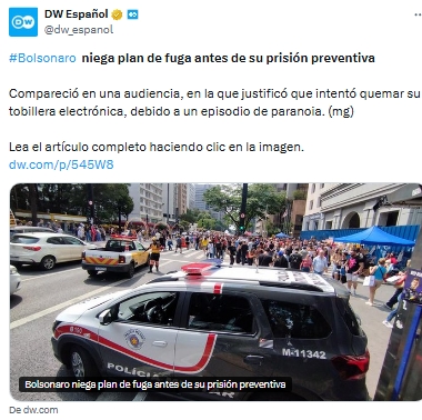 El expresidente brasileño Jair Bolsonaro, en prisión preventiva desde el sábado, negó que quemara su tobillera electrónica para fugarse y achacó su comportamiento a un episodio de "paranoia" y "alucinaciones" producido por la mezcla de medicamentos.