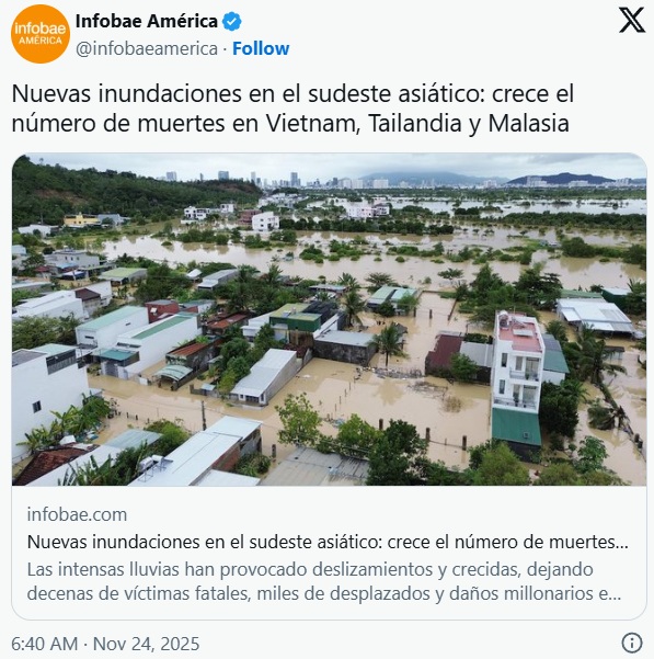 La cifra de muertos por las inundaciones generalizadas y deslizamientos de tierra causados ??por las fuertes lluvias en el sudeste asiático aumentó el lunes con otra persona fallecida en Vietnam y otras cinco en Tailandia, dejando decenas de miles de personas desplazadas.