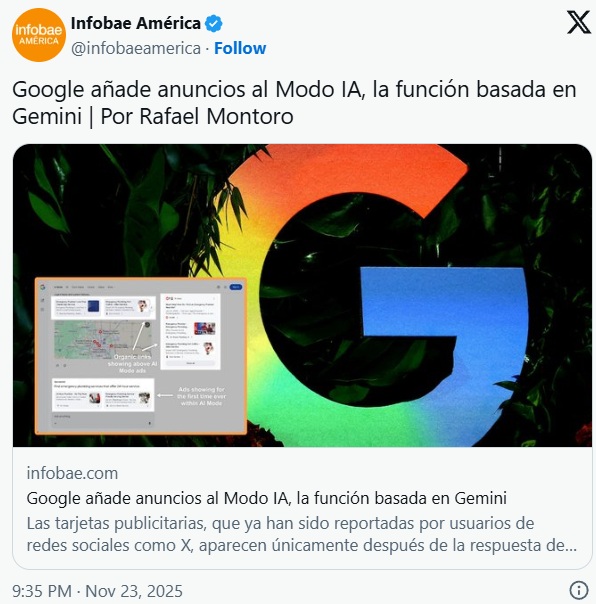 Google ha decidido transformar la experiencia de su Modo IA en el buscador con la introducción de anuncios publicitarios. La función, potenciada por la inteligencia artificial de Gemini, ahora incorpora contenido patrocinado en forma de tarjetas que aparecen tras las respuestas generadas, claramente identificadas como tales.