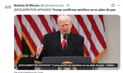 El expresidente de Estados Unidos, Donald Trump, aseguró que el “plan de paz original de 28 puntos”, redactado inicialmente por Washington, ha sido ajustado con aportes tanto de Rusia como de Ucrania, y que solo quedan “algunos puntos de desacuerdo”. Así lo escribió en su red social Truth Social.