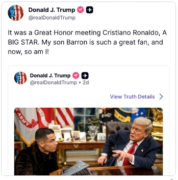 "Fue un gran honor conocer a Cristiano Ronaldo, una gran estrella. Mi hijo Barron es un gran fan, ¡y ahora yo también!", escribió el mandatario estadounidense.