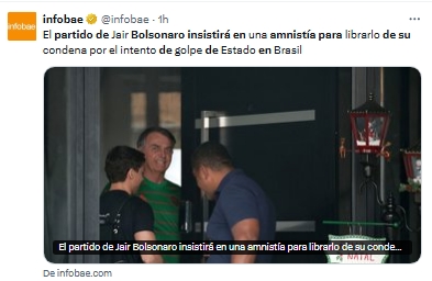 El Partido Liberal (PL), la formación que lidera el expresidente de Brasil Jair Bolsonaro (2019-2022), anunció que insistirá en conseguir una amnistía que libre al líder de la condena por 27 años que tendrá que pagar por golpismo.