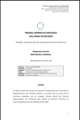 El tribunal revocó en segunda instancia la absolución de 2023 y sostuvo que Uribe Vélez fue "líder y dirigente" del aparato criminal, y ordenó vincularlo con "todas las muertes" presuntamente cometidas por esa estructura. La sentencia no queda en firme hasta que la Corte Suprema decida si admite el recurso extraordinario de doble conformidad, al que tiene derecho todo condenado en primera instancia.