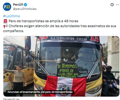 Los gremios de transporte público de Lima y Callao anunciaron que prolongarán por 48 horas el paro iniciado este lunes, a menos que la presidenta Dina Boluarte y otras autoridades de alto nivel accedan a reunirse con ellos para tratar la creciente crisis de inseguridad que afecta al sector.