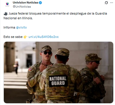 Una jueza federal de Estados Unidos, April Perry, suspendió temporalmente el despliegue de la Guardia Nacional en Chicago por un periodo de 14 días, tras considerar que no existe un riesgo de “insurrección”, como argumentó el gobierno del presidente Donald Trump.