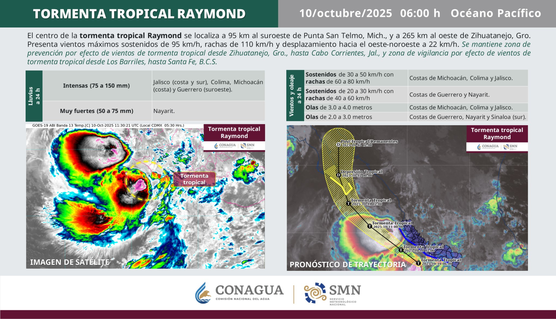Según el reporte más reciente, Raymond mantiene vientos máximos sostenidos de 95 km/h, con ráfagas más fuertes, y sigue una trayectoria hacia el noroeste en el océano Pacífico. El NHC prevé un leve fortalecimiento durante el día, antes de que la tormenta inicie una fase de debilitamiento durante el fin de semana.