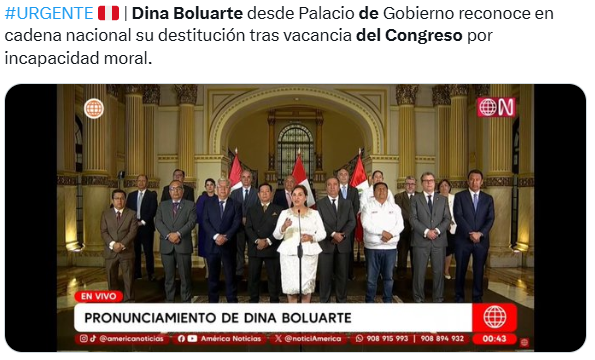 Boluarte emitió un mensaje pregrabado en el Palacio de Gobierno de Lima una vez que el pleno del Congreso había aprobado por 122 votos a favor, de un total de 130 parlamentarios, su destitución inmediata, al declararle con «permanente incapacidad moral» para enfrentar el auge de la criminalidad a escala nacional.