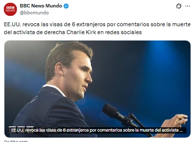 El gobierno de Estados Unidos anunció este martes la revocación de las visas de seis extranjeros que celebraron públicamente el asesinato del activista y comentarista conservador Charlie Kirk, fundador de Turning Point USA, ocurrido en Utah.