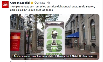 El presidente de Estados Unidos, Donald Trump, advirtió este martes que podría reubicar los partidos de la Copa Mundial 2026 que se celebrarán en los suburbios de Boston, tras afirmar que algunas zonas de la ciudad han sido “tomadas” por los disturbios.